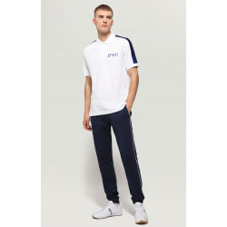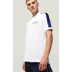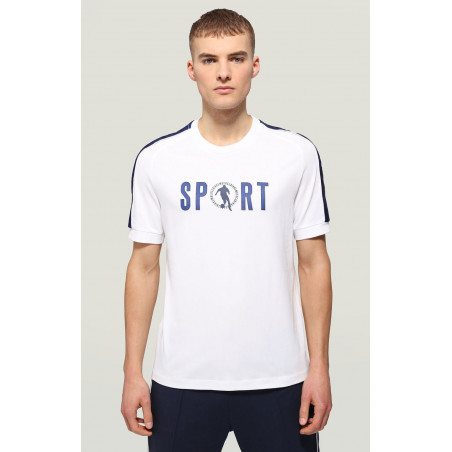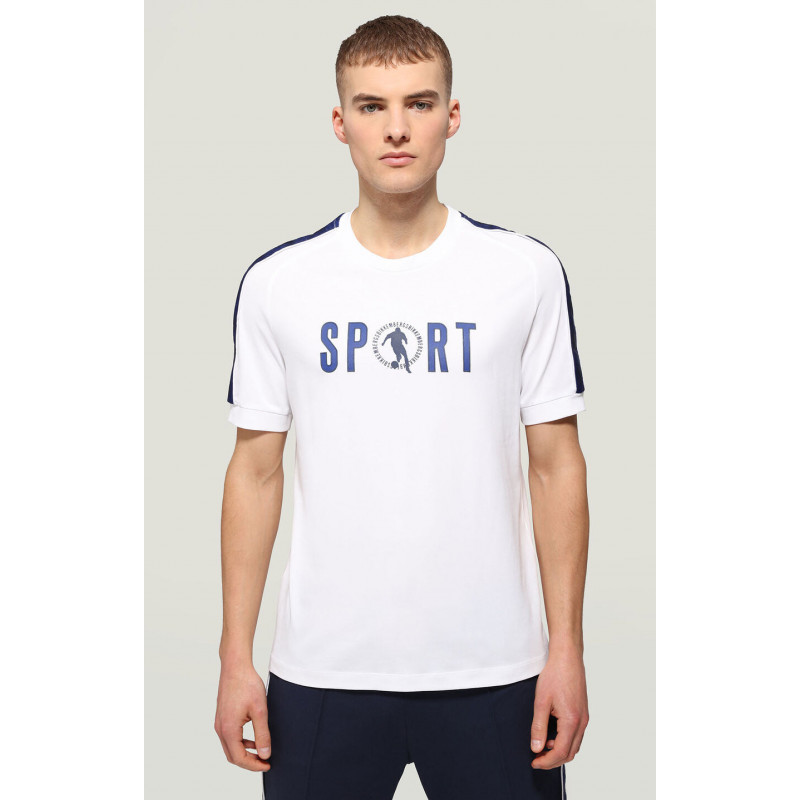 Ideal for sports or leisure activities, this short sleeve men's T-shirt is animated by rubbery print depicting the iconic Bikkembergs soccer player. Made of stretch cotton jersey, the shirt has a catchy urban look. The T-shirt is embellished with ribbed trim along the cuffs and satin tape along the shoulders.